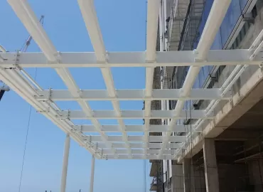 חיפוי אלומיניום 2 מ"מ התבצע בשיטת הרכבה זווית מקומי תוך שמירה על האיטום של המבנה . החיפוי במבנה התבצעה בפרגולות מתכת .